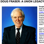 Doug Fraser: A Union Legacy ExhibitionThis online exhibit about Douglas Fraser, former President of the UAW and professor of Labor Studies at Wayne State University, is an adaption of an exhibit that was on display at the Reuther Library in 1998, and again (with edits) in 2008 upon his passing. Doug Fraser, whom everyone knew as “Doug,” was a legendary labor leader. Indeed, Fraser was a person respected by auto executives, Presidents of the United States, heads of states from many lands, and American labor leaders. Moreover, he was simply adored by the rank-and-file members of the UAW, who knew Doug was one of them at heart. After his UAW Presidency ended in 1977, Fraser became a highly regarded Professor of Labor Studies at Wayne State University. This exhibit is just a brief glimpse into the vast career of a great labor leader, professor, and friend. |
