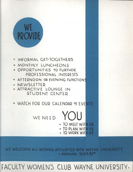 The Faculty Women's Club was founded in 1935, the first year of Wayne University, and its membership was open to any female instructor at Wayne. This organization attempted to fulfill the dual function of providing a social and a professional network for its members, and frequent revisions of its constitution demonstrate a continual struggle between these two aspects of its mission. The organization's constitution initially stated that its purpose was "to promote the interests of all women on the campus and especially to forward the social life and professional interests of the women of the faculty"; later this purpose was changed to read "...the social life and professional interests of the members of the organization." In November of 1951, the Faculty Women's Club hosted a panel discussion on "Women and Service"; in December it hosted, in cooperation with the Faculty Wives' Club, a talk entitled "So You Are Making Yourself a Suit."
