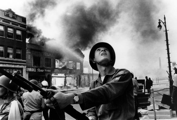 Despite the efforts of the police, looting and fires were widespread. African American business owners frantically marked their shops with phrases like “soul brother” in the hope of being spared, in most cases to no avail. People quickly realized that stolen goods were the least of their worries as flames soon consumed entire city blocks. At 4:30 p.m., the Detroit fire department issued Signal 3-477, a code created during World War II but never before used. This order to muster all able-bodied firefighters to duty drew men and equipment from 44 other communities. Fires continued to spread throughout the five-days of unrest, with the bulk of them set within the first two days. That Monday proved to be the most destructive, with 483 fires reported.